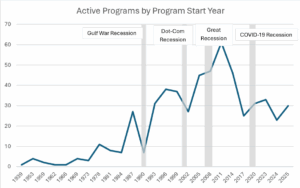 Although the number of incentive programs continues to increase, new incentive program creation has steadily declined over time. As shown in Figure 1, the number of new programs peaked in 2011 and has followed a downward trend since then. While 2025 shows a spike in new programs, the broader trend suggests that states have generally reduced their rollout of new incentive programs. Generally, in response to recessions, states appear to introduce more new incentive programs, For example, in 2020, several states introduced programs to reduce business disruption risks. Such as Maryland’s Manufacturing Disruption Mitigation Assistance Program (MDMAP) and Montana’s Agriculture Adaptability Program.