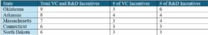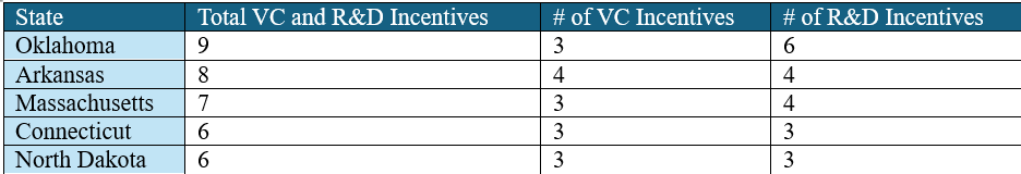Alaska, Missouri, and South Dakota are the only states that do not currently offer business incentives designed specifically for startups or research and development. Conversely, Puerto Rico is the only US territory that offers incentives, providing one R&D tax program and two R&D grant programs. On average, a US state offers three VC or R&D incentives. Five states—Oklahoma, Arkansas, Massachusetts, Connecticut, and North Dakota—provide at least double the country’s average number of programs.